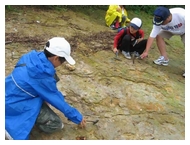 地層に直接触れたり、ハンマーを使って化石をさがしながら