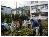 ☆ 最初の農業指導(サトイモ編) 子どもたちが意志と熱意で解決できる場をつくること 4年前、思いがけない転勤命令がおりて、池上本門寺の広大な山懐に抱かれ、都会の中にあっては驚くほど季節感豊かな池上小学校から、全くといってよいほど自然がない渋谷区立中幡小学校に赴任した。 私は常々、現在の学校教育において何よりも大切なことは、子どもたち自らが自分の手で実際に体験し、その体験を通して様々な課題を見つけ、それを自らの意志と熱意で解決していける場を設定することだと考えている。また、日本人にとって、なによりも大切な感性は季節感であり、子どもたちに教えていかなければならないと考えている。そのためには自然と親しむことができる環境を作ることだと確信している。 野菜づくりを通して、自然と季節感を味あわせる これは幸運である。瞬間的に私は、この畑で野菜作りの体験を通して、自然に親しむこと、季節感を味わうことができる子どもの育成を決心した。 命の教育の場にしよう 早速次の日、長靴に履き替えて畑に入ってみたが、雑草がはびこっている。土壌も酸性で痩せているので、まず土作りから始めなければならないが、この広い畑は、当時多くの学校がどのように指導を進めるか悩んでいた『総合的な学習』の場として最適である。 教職員に『この畑は「命の教育」の場として相応しい。私が先頭になって指導するから一緒に野菜作りを通して、子どもたちに自然の素晴らしさを教えよう。』と呼びかけ、土作りや種まきなど、野菜作りの指導を始めた。 サトイモが最適 一方、教育委員会には何度もお願いし、校庭との間をネットで仕切ること、水道施設を引っ張ってくることを交渉し、その年の夏休みまでに完成させた。これで体育活動のボ-ルなどの進入を防ぎ、冠水が容易になって野菜づくりがしやすい環境ができた。 鍬を持って土地を耕し大量の腐葉土と鶏糞、そして苦土石灰を敷き込む。野菜作りに興味を持たせるには、何より驚くほどの収穫を味わわせることである。そのためにサトイモが最適である。 子どもたちが芽を発見したら半部以上は成功 植え終わったら、まっ平らにしておく。しばらくして雨が降るとイモを植えた部分は少しへこむ状態になるので、植えた場所はわかるのだが、大勢の子どもが入る畑なので、テ-プを張って踏まないように注意を与える。 サトイモの芽生えは遅い。一月もするとサトイモを植え込んだ畑は、一面雑草に占領されるが、その中で気の早いサトイモは、遠慮がちに小さな芽を出しはじめる。子どもたちがこの芽を発見したら、サトイモ作りは半分以上成功したと言っても差し支えない。 抜いた草にも命があることを学ぶ 芽を観察させて、この芽と違う草は栽培には必要ないこと教え、注意深く除草することを教える。『草抜き』という作業は全員初めてであるが、土には不思議な力があり、間違いなく子どもたちは熱心に、ていねいにこの作業を進める。抜いた草にも命があること、そしてごみ箱などには決して捨てず、畑に埋め戻すことによって、命が肥料になって野菜の成長に役立つことを、その場で指導することも忘れてはならない。 露を集めて、毛筆の練習をさせる すっかり雑草を取り除くと、ほんの小さな芽をも見えるようになり、子どもたちはこの芽に労りの心を配るようになる。芽がでそろったこの頃に、ていねいに土を寄せてやると、畝ができる。七夕の頃には、はっきりとサトイモとわかる葉が広がり、葉の上には丸い露がたまるようになる。 『昔から、その露を集めて墨を摺って、七夕の短冊に願い事を毛筆で書くと、かなえられると言い伝えられている』と言って、露を集める。この日毛筆の練習をさせると、いつもより間違いなくていねいな字を書く。 野菜作りは中幡小学校の代名詞になった 私の最初の農業指導は、このようなものだった。有能な教師も多く、初めての経験ながら大変興味を持ち熱心である。その姿勢が子どもに伝わり、野菜に対しての愛情がわいてくる。夏休みに草抜きという重労働があるが、抜いた草を株の根元に敷きつめ、もう一度大きく土寄せをする。最初は土地がやせて養分がなかったので、少量の化成肥料を追肥した。後はお天気任せ、二学期になっても葉はどんどん茂り、11月の中旬までそのままにしておく。いよいよサトイモ堀りであるが、この年は、およそ200kgほどとれたので、子どもは大喜び。教師もびっくり、親も感激で学校中大いに盛り上がった。 今日、『畑での野菜作り』は定着し、本校の代名詞の一つになっている。 ■バックナンバー 私の実践している自然体験活動 第1回 私の実践している自然体験活動 第2回 私の実践している自然体験活動 第3回 私の実践している自然体験活動 第4回 私の実践している自然体験活動 第5回 奥多摩での2日間~中幡幼稚園『奥多摩宿泊自然体験活動』レポ-ト~ 第1回 奥多摩での2日間~中幡幼稚園『奥多摩宿泊自然体