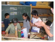 ・竹とんぼ、竹箸作り。小刀で竹を削り作成、竹の厚さで飛び方が変わり難しかった。